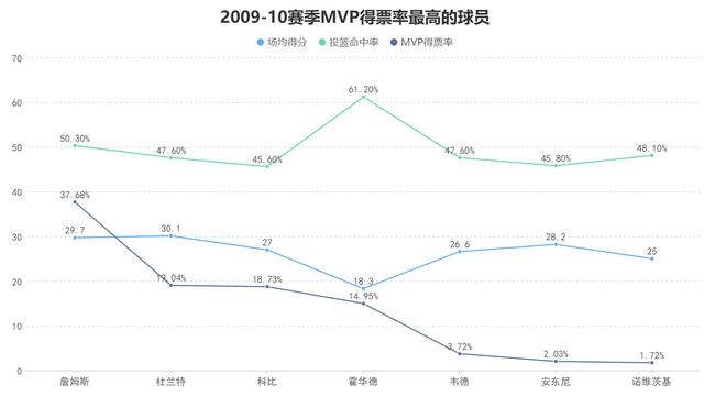 球队战绩不具备优势同时科比的个人数据也没有达到赛季的顶尖,这也导致科比本赛季仅有联盟第三18.73%的MVP得票率,这与许多人印象里MVP不是詹姆斯就是科比的情况有所不同,凯文杜兰特拿下了本赛季得分王的同时也有着超过科比的MVP得票率,最终詹姆斯以巨大优势蝉联了常规赛MVP,从常规赛来看科比除了一阵一防外没有取得其他的个人荣誉。