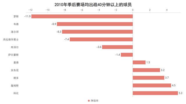 虽然季后赛科比的场均29.2分依然只位于联盟第三高,但科比的净效率达到了5.3,这意味着本赛季季后赛当科比在场时湖人每百回合可以净胜对手5.3分,这个净效率位于季后赛场均出战40分钟以上的各个球队绝对核心中的第一,这也可以表明科比的在场正面作用是联盟各球队最倚重球员里的最强。