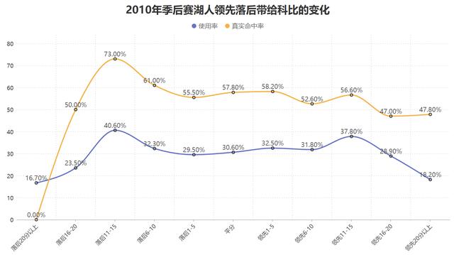 同时,季后赛里当湖人落后时科比的使用率较为接近但真实命中率明显高于湖人领先时,这意味着当湖人处于落后局面下科比消耗的出手机会没有太大改变,但结合三分与罚球后的真实得分效率有了明显的提升,科比在湖人面临落后情况时的发挥要强于湖人领先时,这个赛季季后赛的湖人延续了常规赛的风格,可以用绝境看科比来形容。