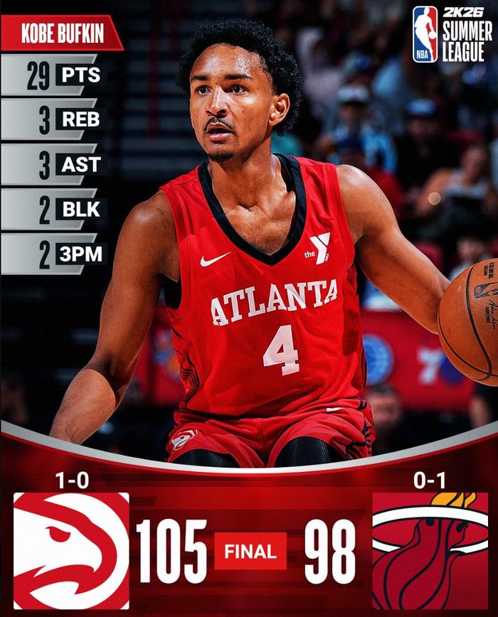 北京时间7月12日,NBA夏季联赛,老鹰105-98击败热火,这场拉斯维加斯的夏联相当精彩,老鹰队2023年的15号秀与热火队2025年的20号秀形成了对轰的局面,巴夫金轰下29分,亚库乔尼斯轰下24分,这两位年轻球员的发挥让现场球迷大呼过瘾。