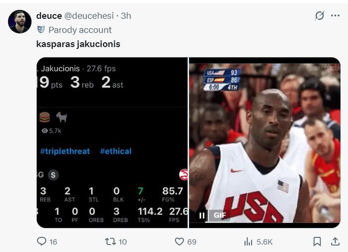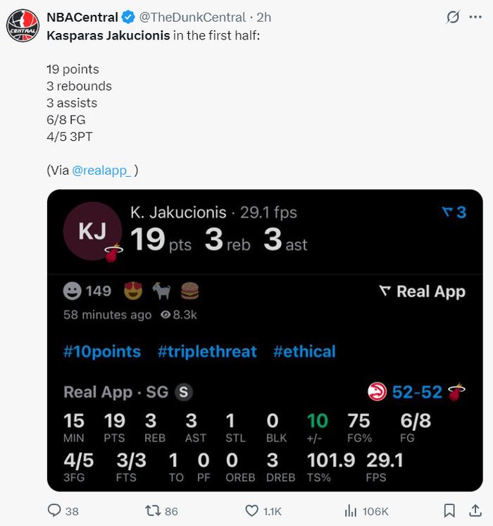 立陶宛小将亚库乔尼斯今年只有19岁,他是在首轮20顺位被莱利捡漏的高大控卫,他是裸足6尺6的控卫,这场比赛他首节5中4+三分3中3拿到14分,上半场15分钟8中6+三分5中4拿到19分3篮板3助攻1抢断1失误。