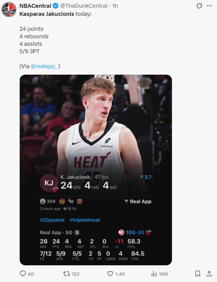 15中1后迎大爆发!20号秀轰24+4被赞如科比 热火兜售罗齐尔是为他?