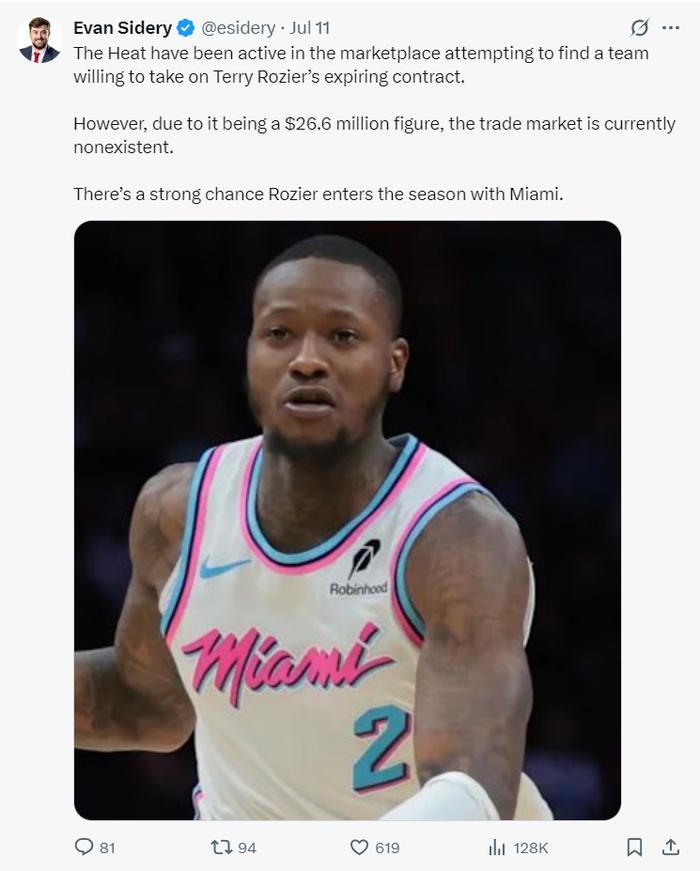 北京时间7月11日晚,福布斯体育记者埃文-斯迪瑞透露,热火队一直在交易市场上找球队接受罗齐尔的到期合同,但罗齐尔薪水高达2660万美元交易市场上目前无人问津。很明显热火想要送走罗齐尔是为亚库乔尼斯腾出替补控卫的位置,毕竟这位来自欧洲联赛的小将已经有3年职业赛场+1年NCAA经验。
