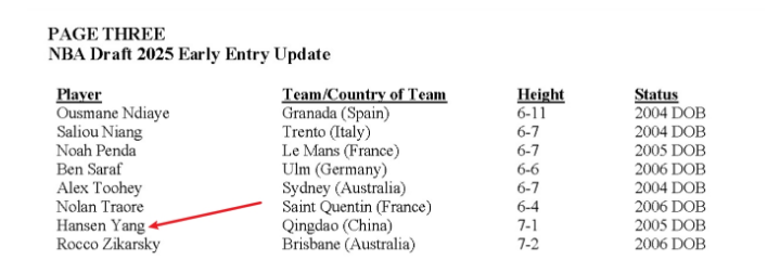 NBA官宣最终提前选秀名单剩46人:杨瀚森在列 林葳到年龄自动参选